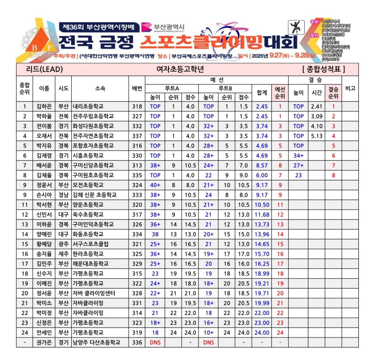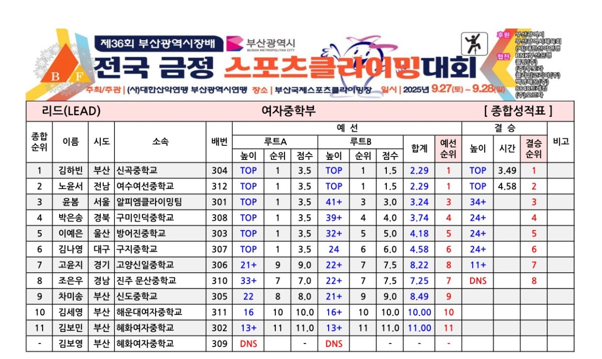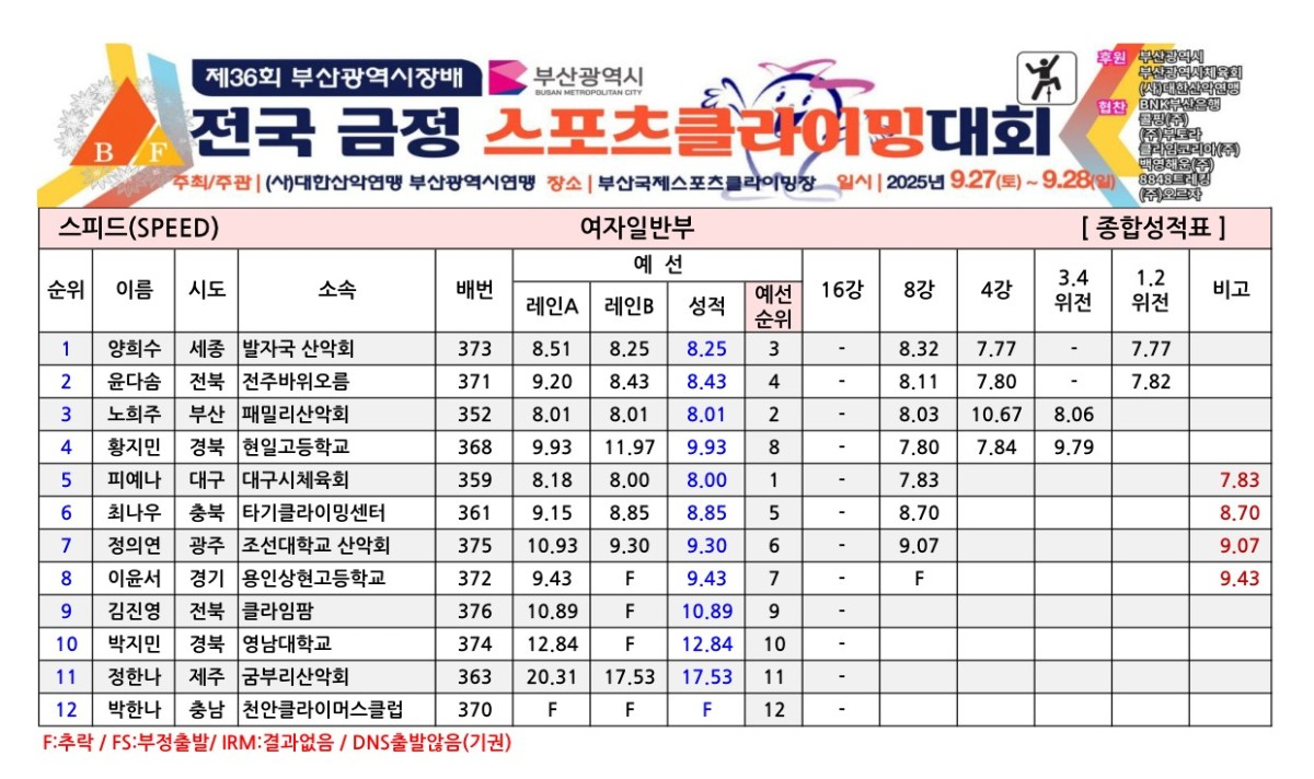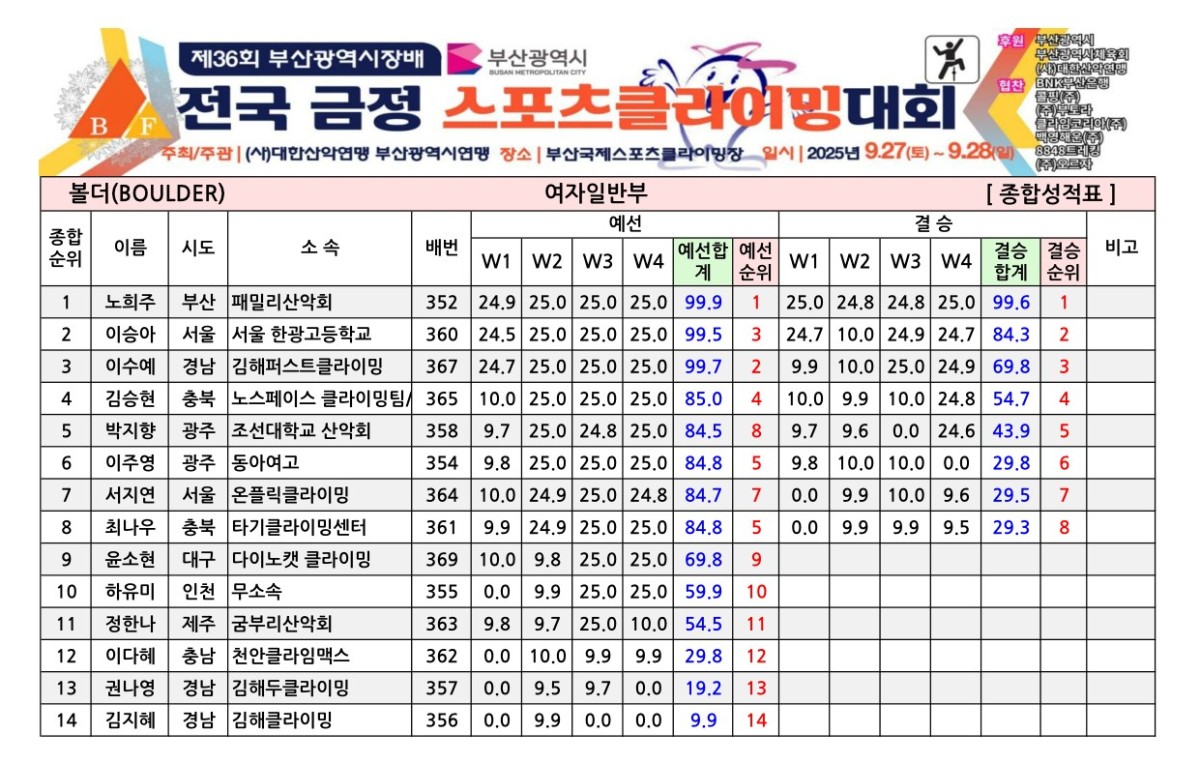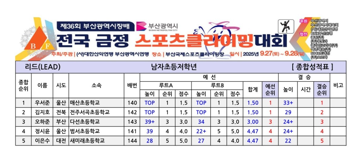 제36회 부산광역시장배 전국금정스포츠클라이밍대회 경기결과