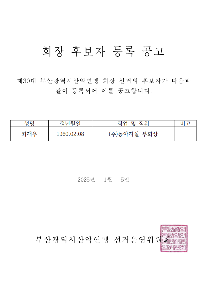 (사)대한산악연맹 부산광역시연맹 제30대 회장 선거 후보자 등록 공고
