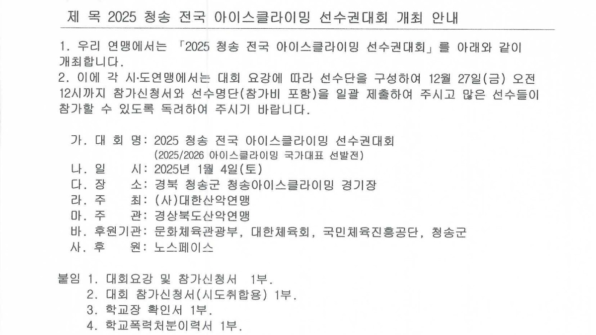 2025 청송 전국아이스클라이밍 선수권대회 개최 안내( 2025/2026 아이스클라이밍 국가대표 선발전-제106회 동계체전 부산대표선발전)