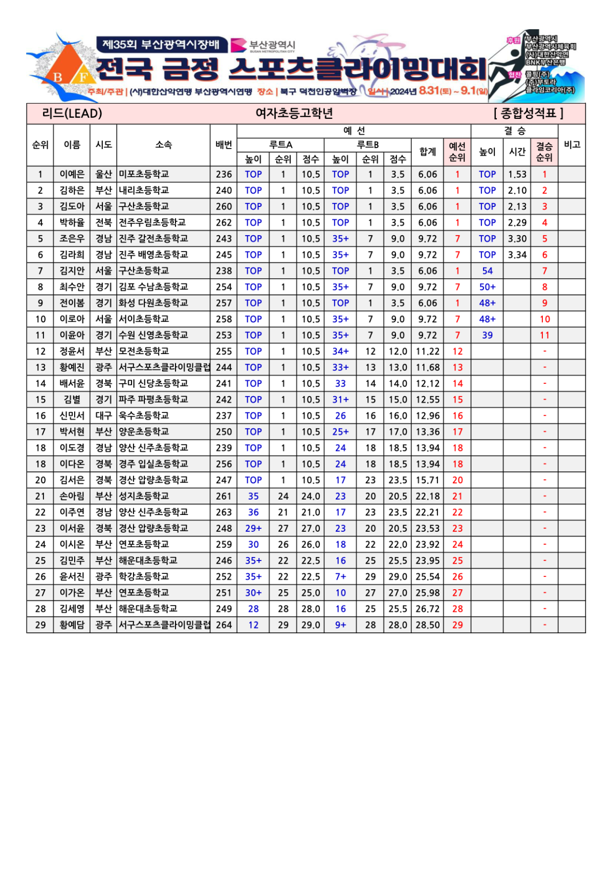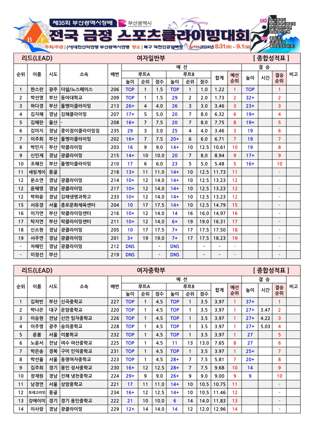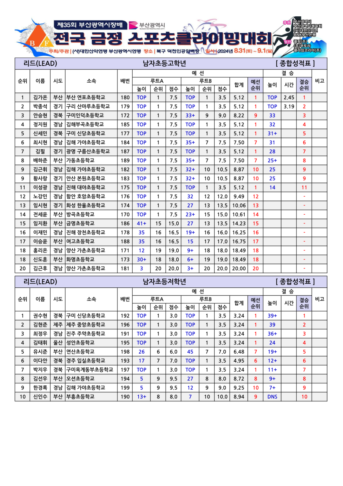제35회 부산광역시장배 전국금정스포츠클라이밍대회 경기결과