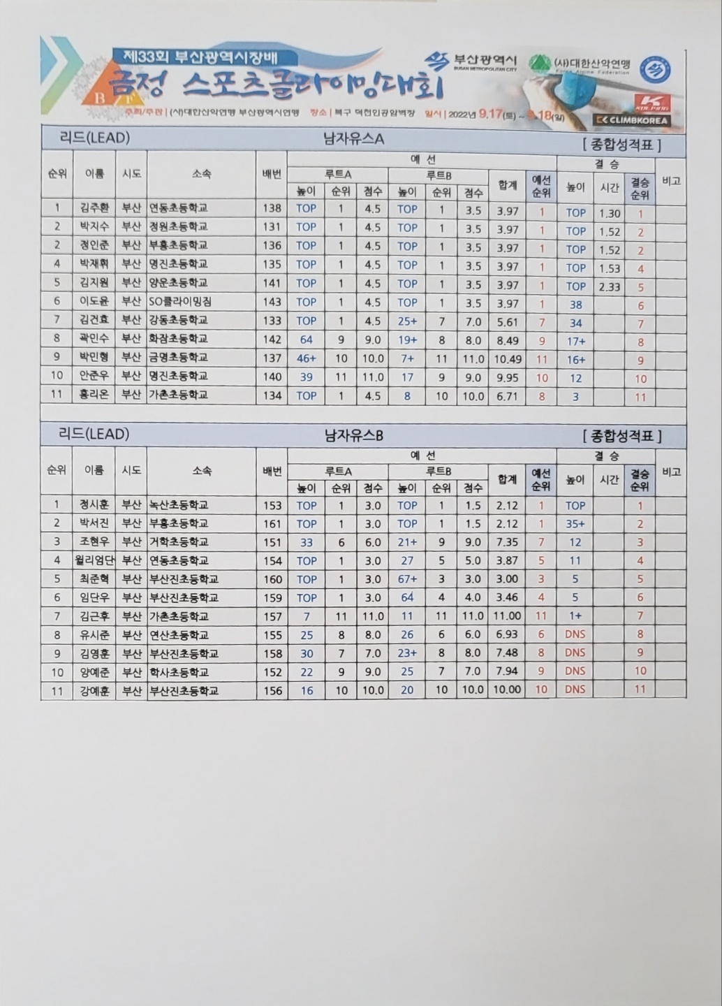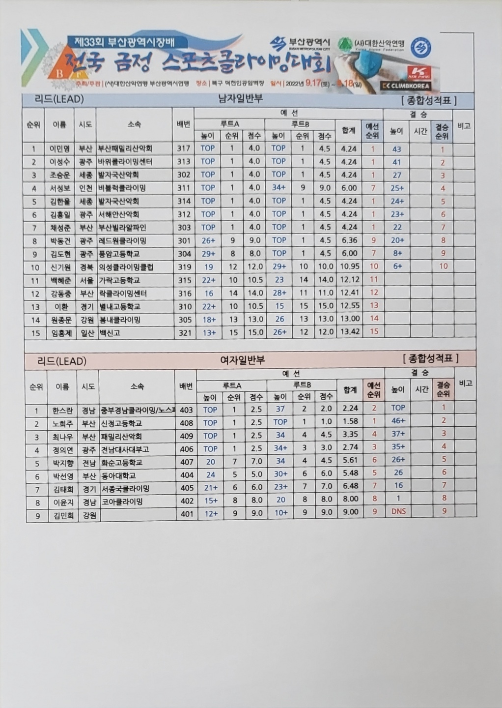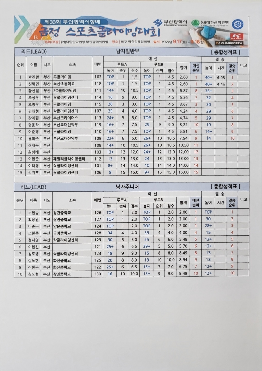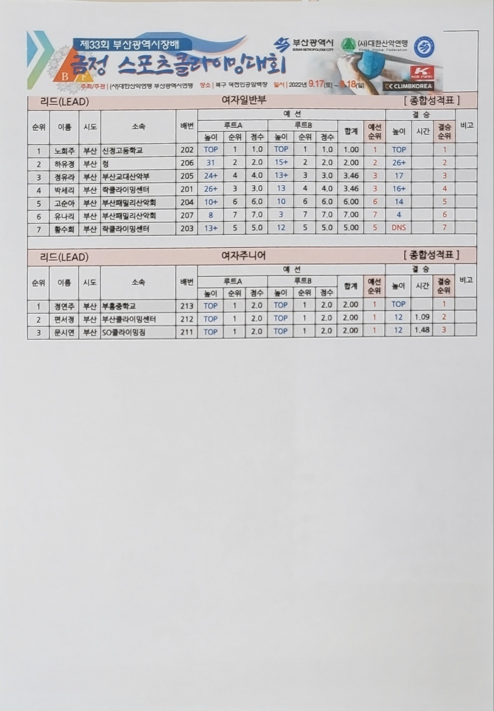 9월 17일~18일 개최된 제 33회 부산시장배 금정스포츠클라이밍대회 결과입니다