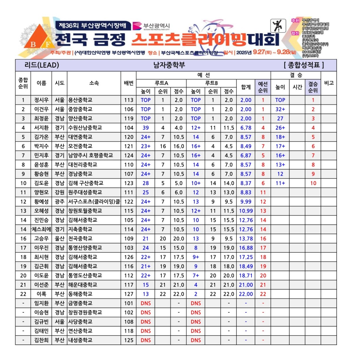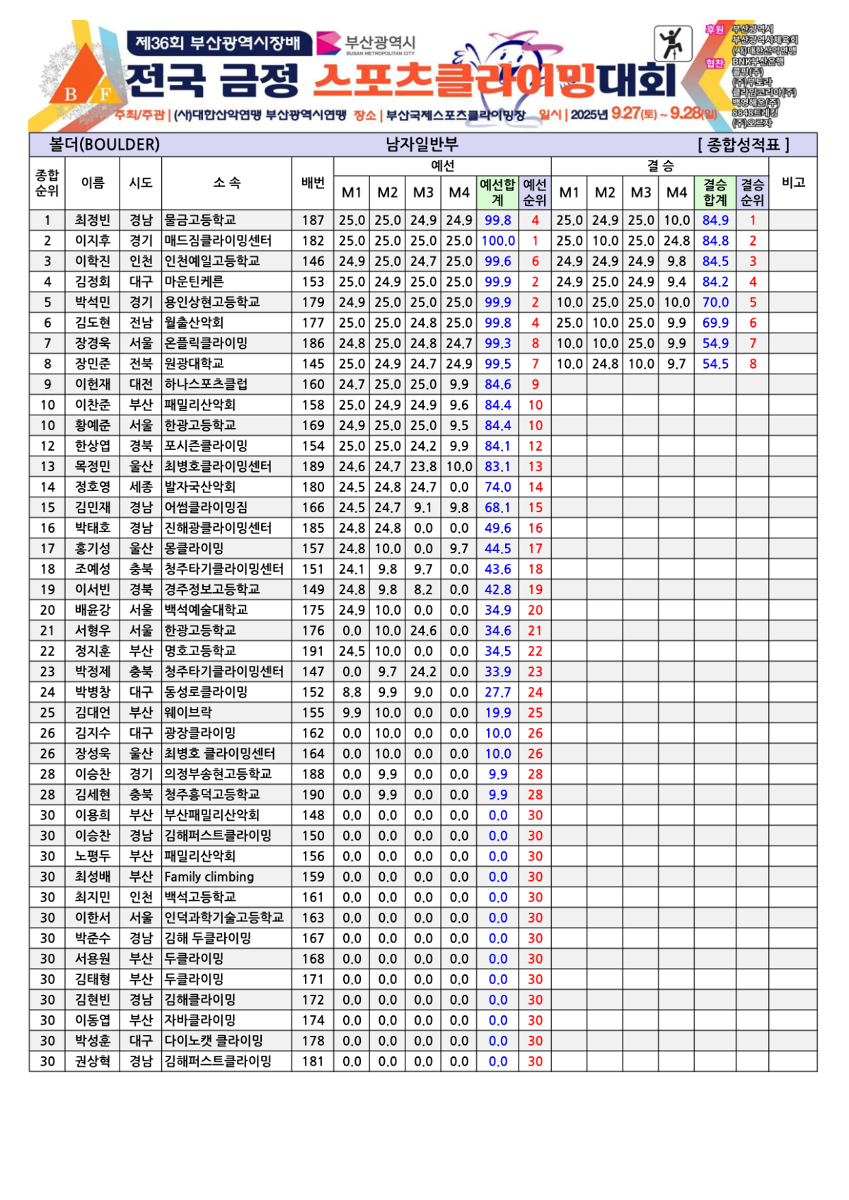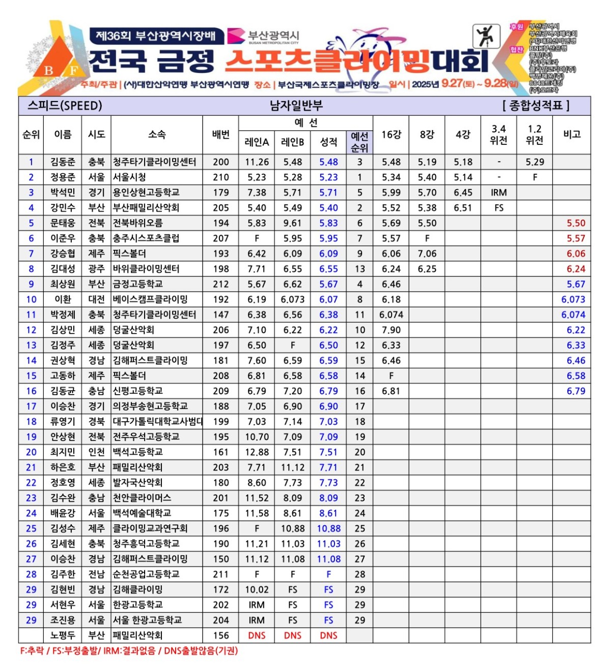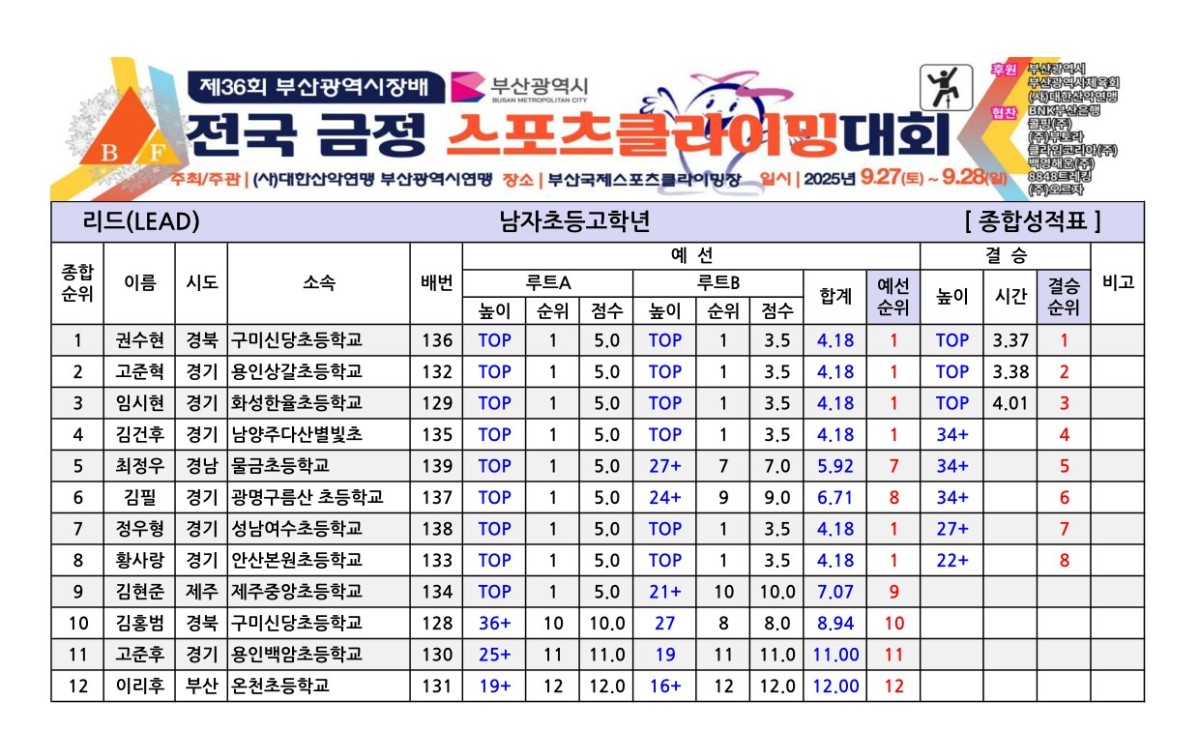제36회 부산광역시장배 전국금정스포츠클라이밍대회 경기결과