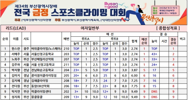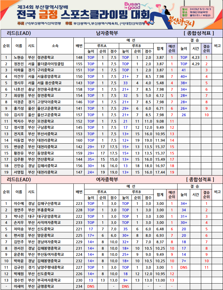 제34회 부산광역시장배 전국 금정스포츠클라이밍대회 최종순위