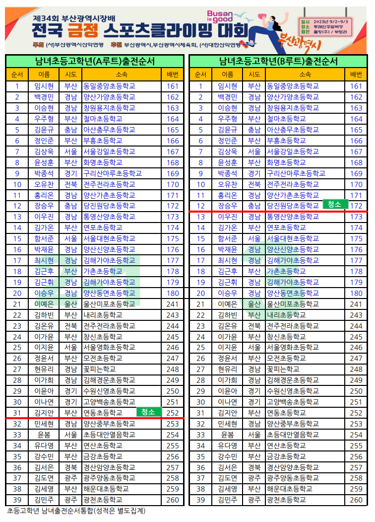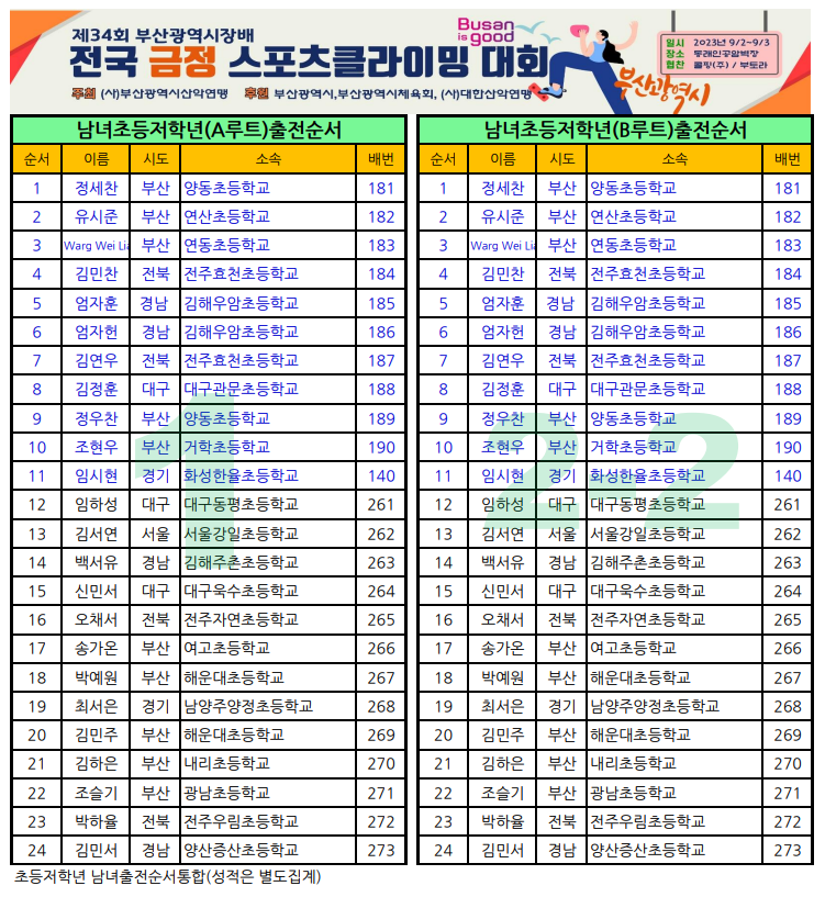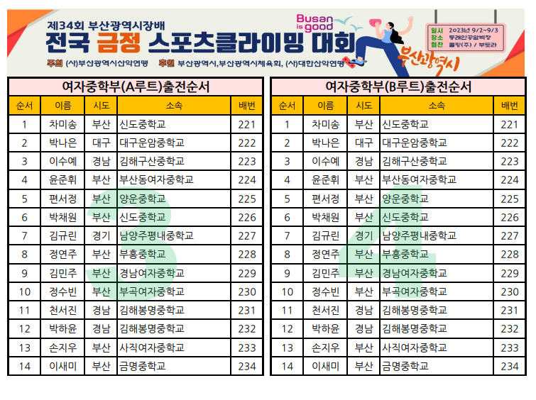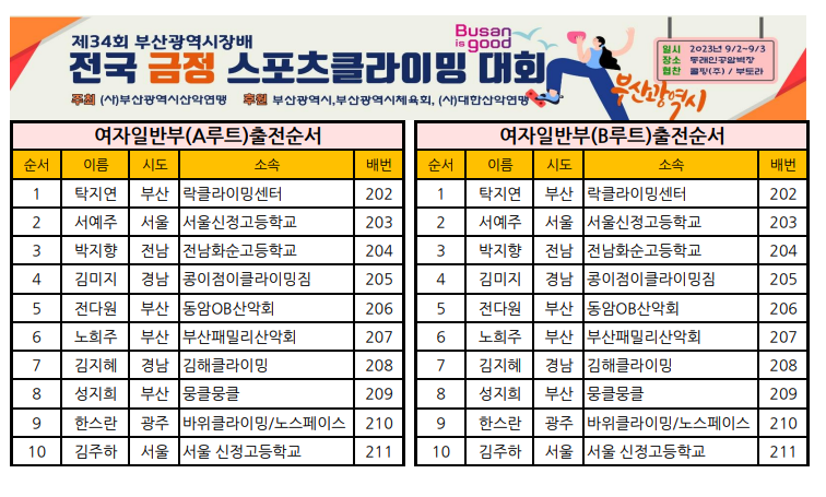 제34회 부산광역시장배 전국 금정스포츠클라이밍대회 일정표 및 출전순서 안내
