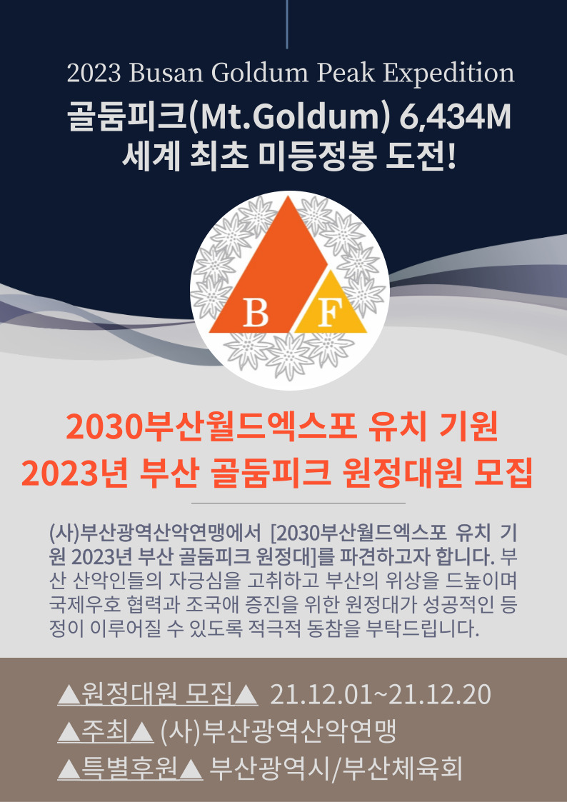 3. 원정목적 : 세계 최초 미등정봉에 부산 산악연맹의 원정대를 파견하여 2030 부산 월드엑스포 유치 기원과 부산의 위상을 드높이고 부산 산악인들의 자긍심 고취와 외국 산악인 및
