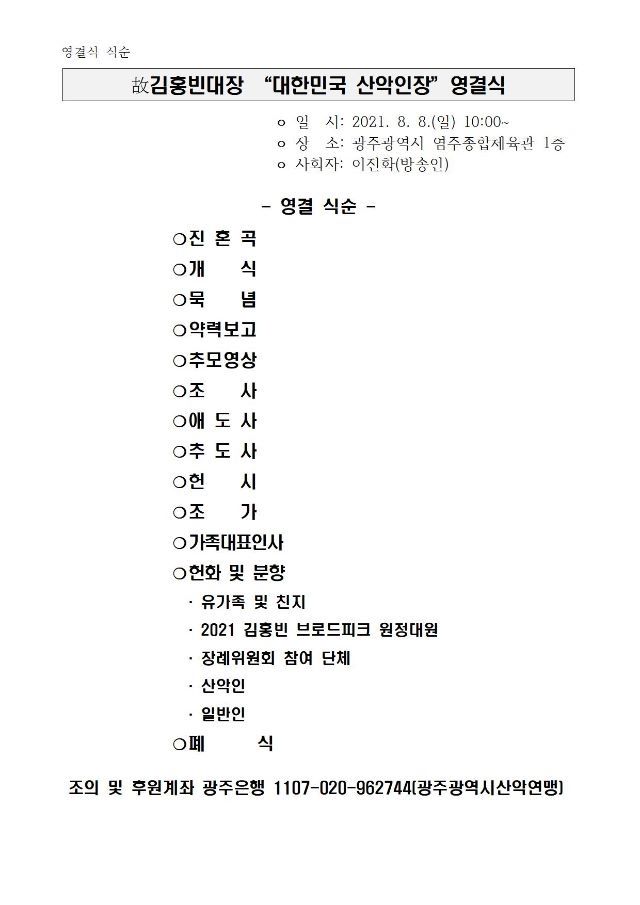 또한 故 김홍빈 대장의 장례는 8월 8일(일)까지 광주 염주체육관에서 산악인장으로 엄수됩니다. 아래 내용을 참고하여 분향소 및 영결식에 많은 분들이 조의를 표 할 수 있도록 협조바랍니다.
